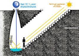 Il sole illumina perfettamente il fondo del pozzo; scendendo le scale con i suoi raggi, si riflette dentro il pozzo sino a toccare l’acqua.